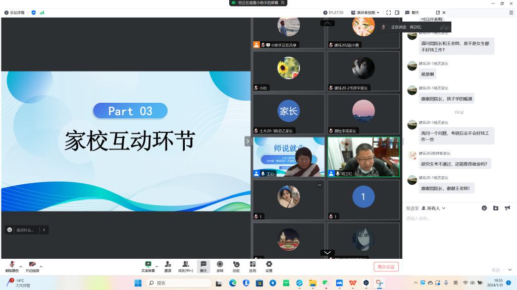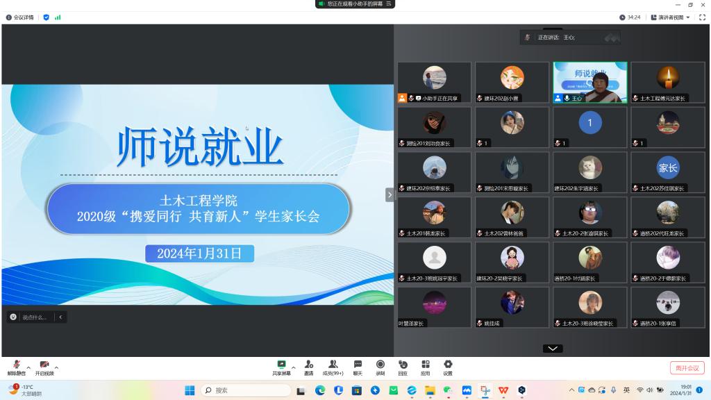 2月1日,乐动在线-乐动(中国)土木工程学院“家校共育,共促就业”家长会于线上召开,学院院长周卫红教授应邀出席并围绕职业生涯规划和就业指导等内容展开宣讲,2024届毕业班辅导员、全体毕业生及家长参加会议。
